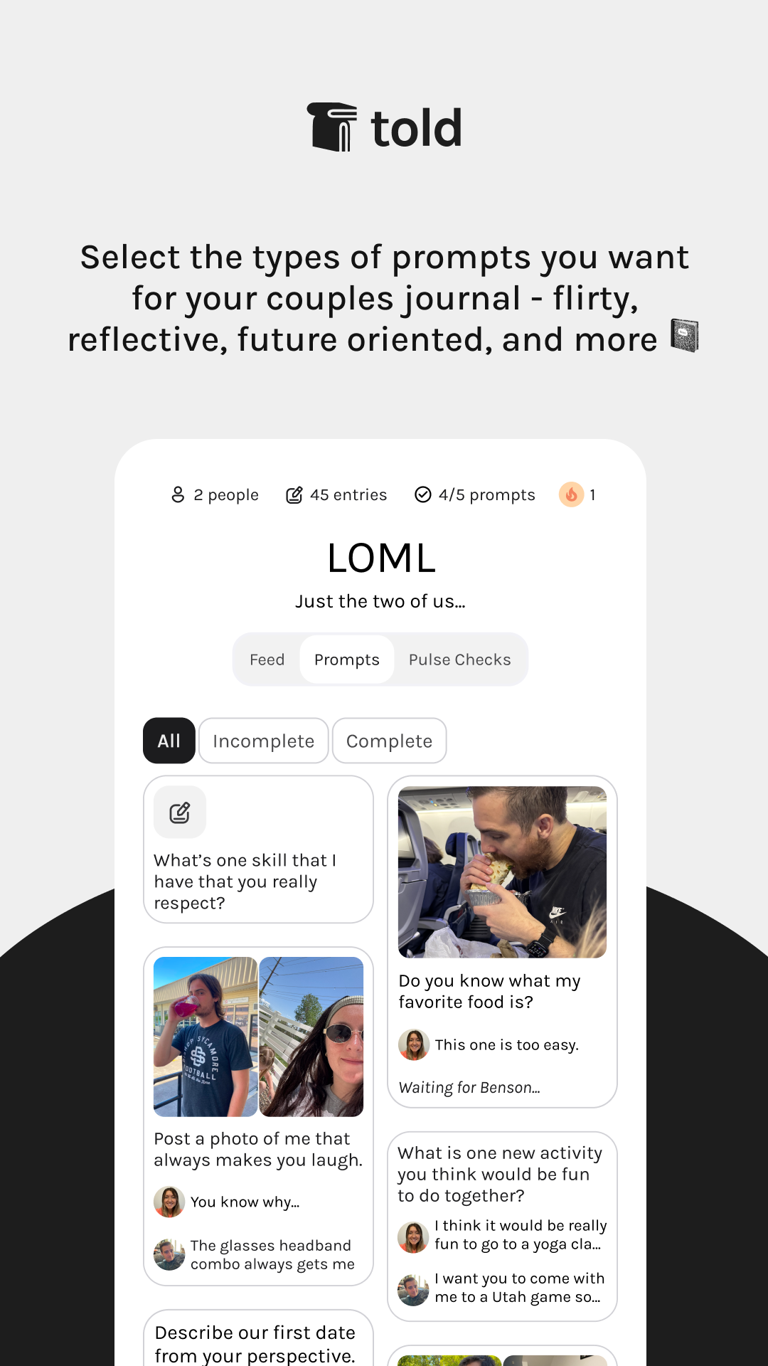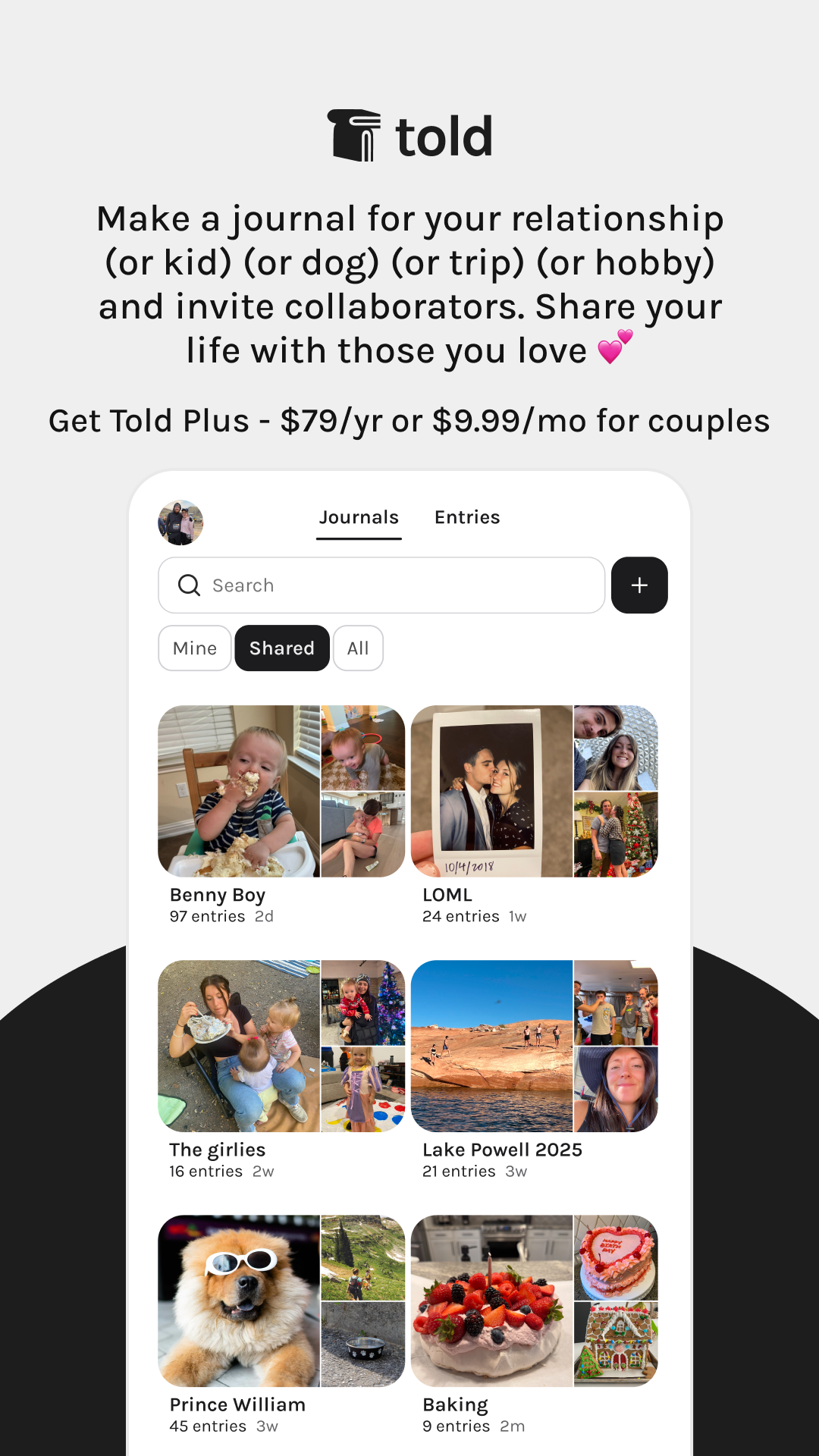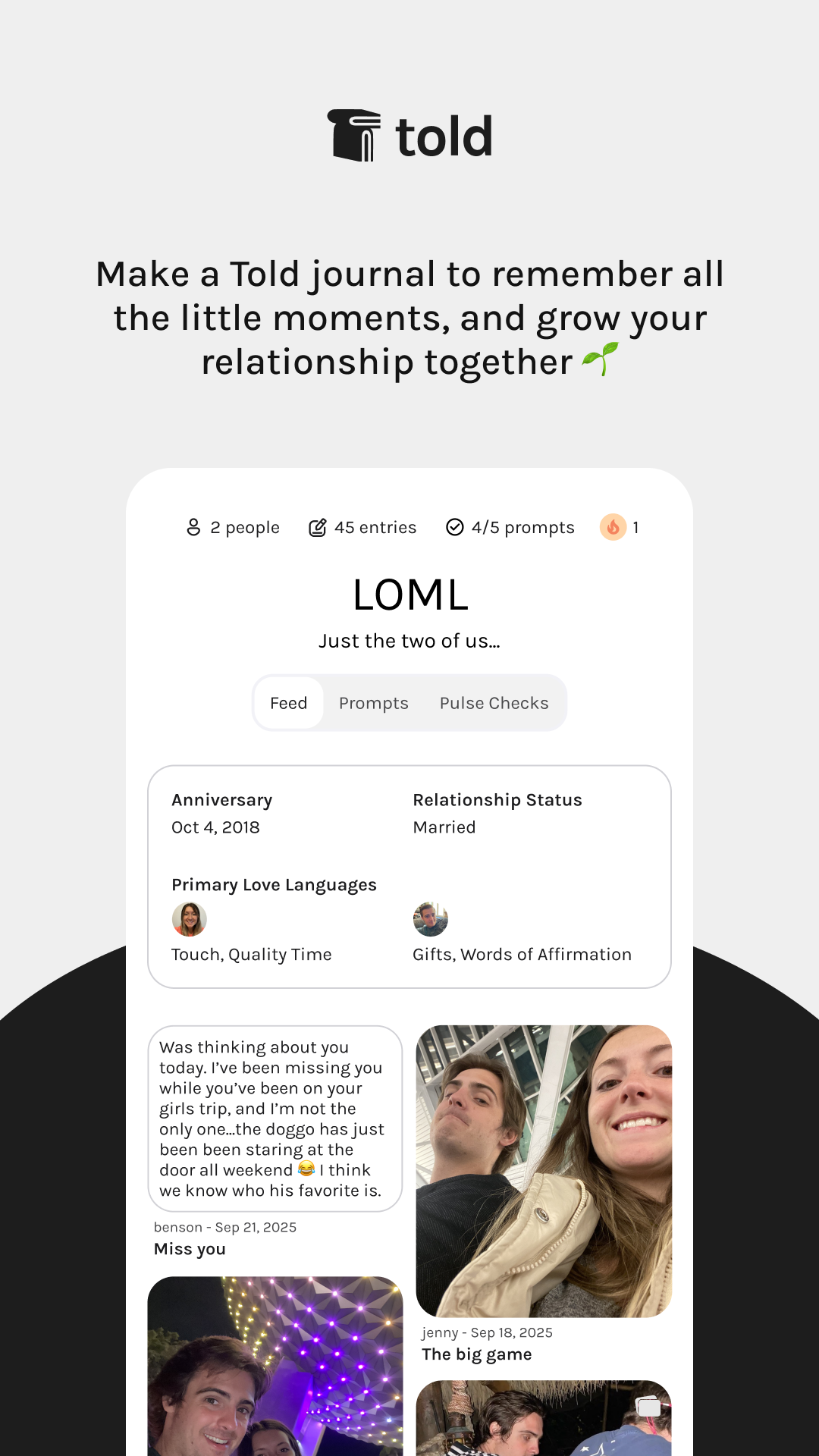 If Couples can achieve deeper connection, strengthen their relationship, and have a cute digital documentation of their relationship through Told+ premium journal prompts they will subscribe to Told+ for $50-80/yr.